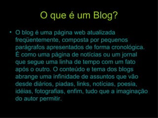Um blog é uma página web atualizada frequentemente com pequenos parágrafos em ordem cronológica sobre qualquer assunto. Blogs podem servir para expressão pessoal, comunicação entre pessoas com interesses comuns, ou compartilhar experiências como uma gravidez. Eles permitem que as pessoas publiquem ideias que não caberiam em outros meios.