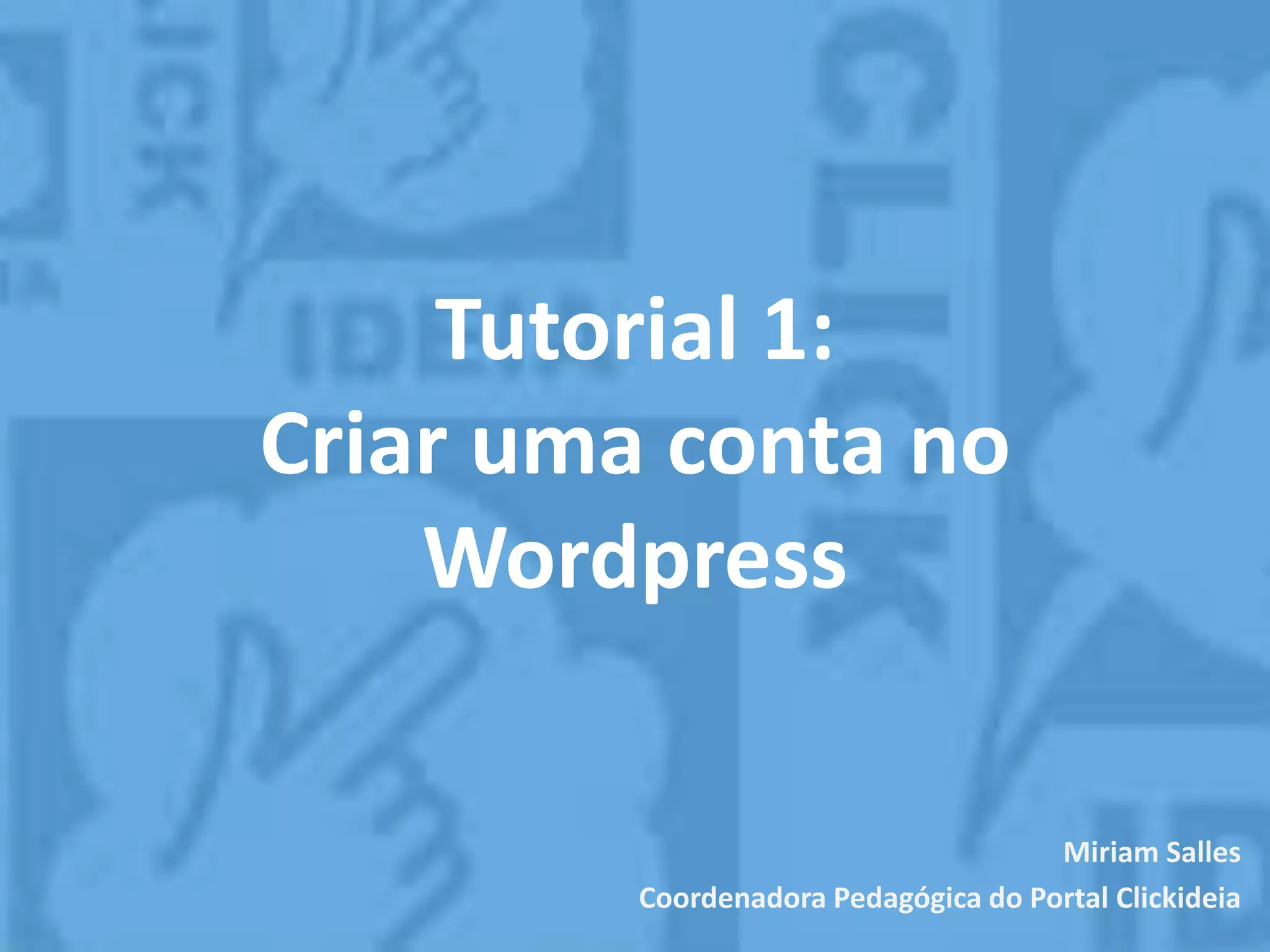 Este tutorial ensina como criar uma conta no Wordpress em 5 passos: 1) clicar em "cadastre-se agora", 2) preencher o formulário com seus dados, 3) verificar a conta por email, 4) definir login e senha, 5) acessar a área administrativa do blog.