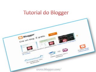 O documento descreve um tutorial sobre como criar e configurar um blog no Blogger, ferramenta de blogs do Google. O tutorial explica etapas como criar uma conta, escolher um modelo e layout, adicionar configurações básicas e avançadas e personalizar a aparência do blog.