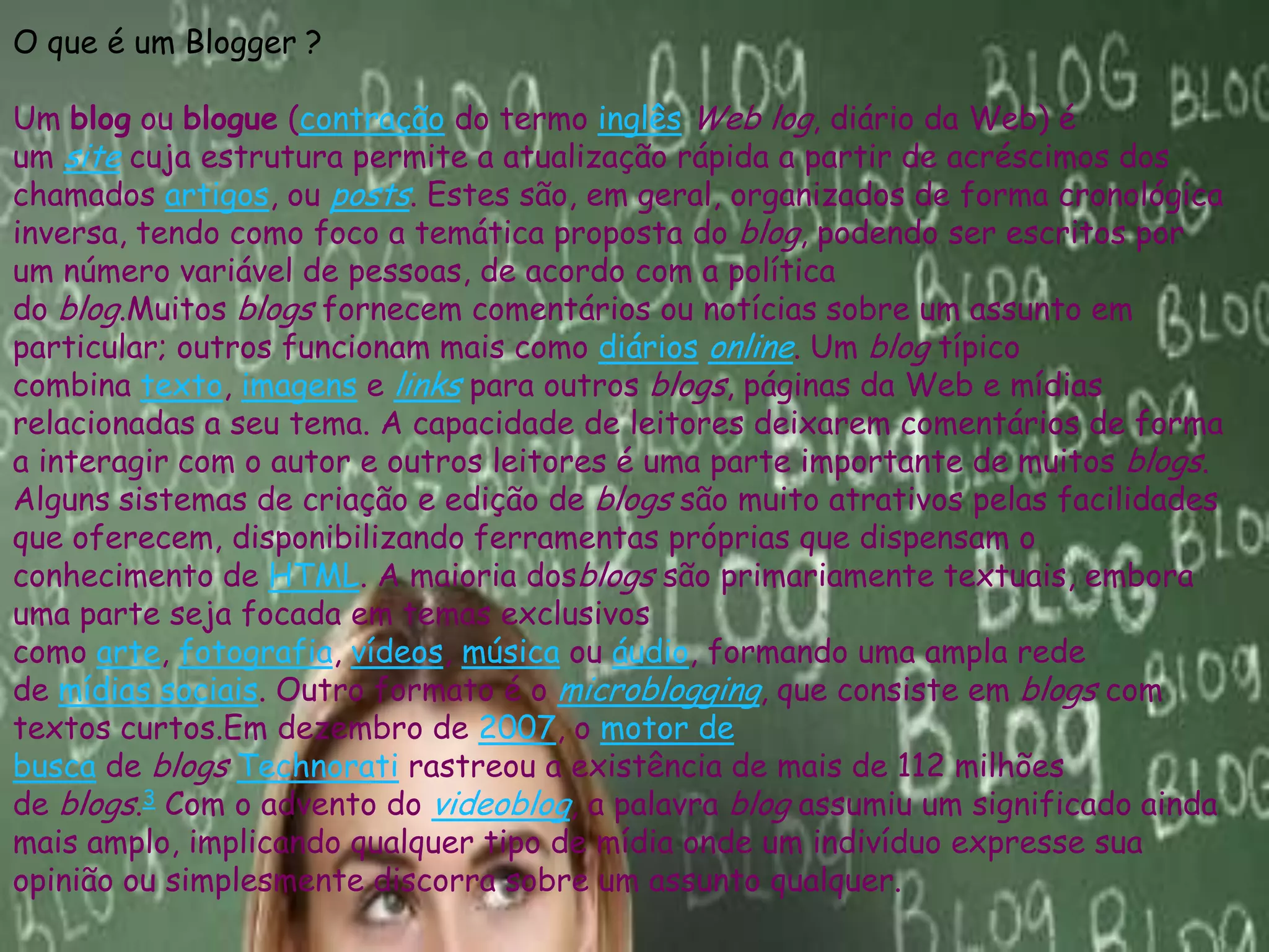 Um blog ou blogue é um site cuja estrutura permite atualizações rápidas de artigos ou posts de forma cronológica inversa. Muitos blogs fornecem comentários ou notícias sobre um assunto específico. O Blogger foi uma das primeiras ferramentas dedicadas à publicação de blogs e popularizou o formato, permitindo a criação de posts de forma fácil sem necessidade de conhecimento em HTML.