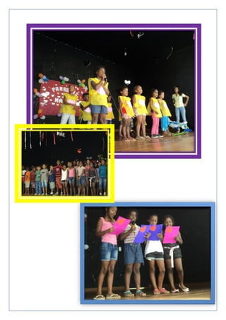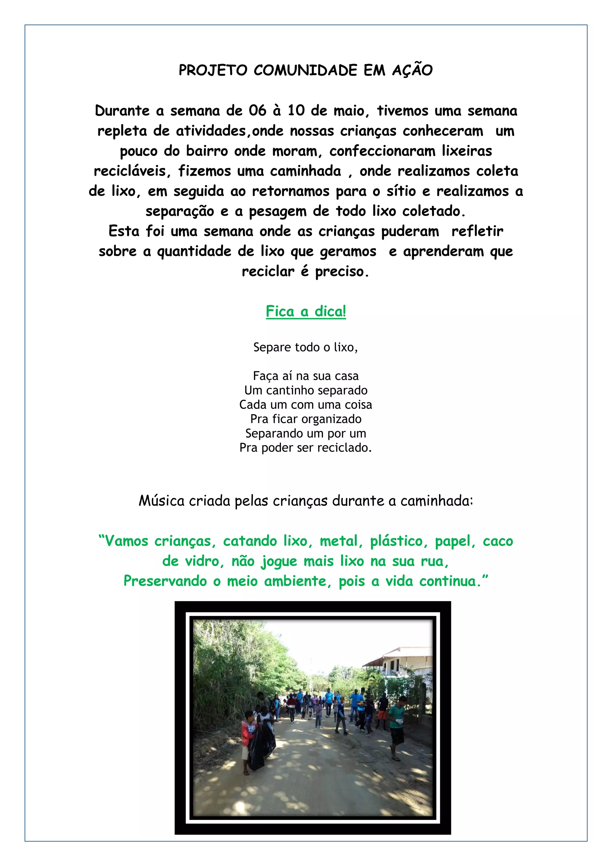 O documento descreve as atividades realizadas durante a Semana da Comunidade em Ação no bairro, incluindo uma caminhada de coleta de lixo, separação e pesagem do lixo, e criação de uma música pelas crianças sobre preservação ambiental. Também celebrou o Dia das Mães no Projeto Turma do Sítio com café da manhã e apresentações para as mães. Por fim, relata sobre um torneio de bolão realizado no projeto que contou com a participação empolgada de pais e filhos.
