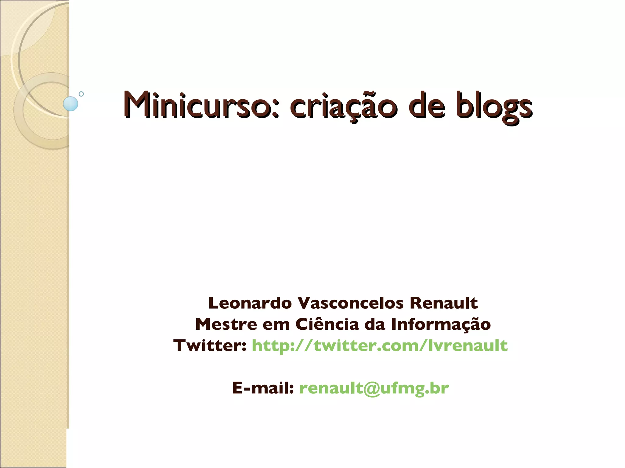 Minicurso: criação deblogs Leonardo Vasconcelos Renault Mestre em Ciência da Informação Twitter: http://twitter.com/lvrenault E-mail: [email_address]