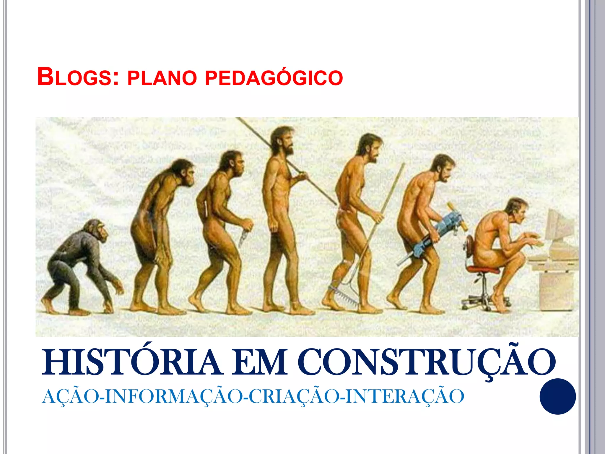 Este documento propõe o uso de blogs para apoiar o ensino e aprendizagem de História, permitindo que professores e alunos publiquem atividades online e interajam. Os blogs seriam usados para tarefas, calendários, desafios de leitura e escrita, compartilhamento de fotos e trabalhos dos alunos. Os alunos seriam avaliados pela sua participação e produção no blog.