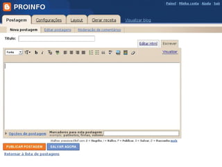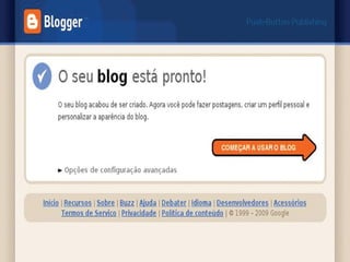 O documento descreve o que são blogs, para que servem e como criá-los. Blogs permitem que qualquer pessoa publique conteúdo na internet de forma gratuita e fácil. Eles podem ser usados como diários digitais ou para publicar notícias. Projetos de aprendizagem podem criar blogs para divulgar seus resultados.
