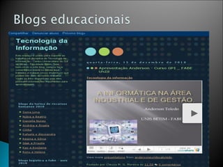 O documento discute a história e uso de blogs, incluindo como criar um blog e manter um. Blogs podem ser usados para entretenimento, compartilhamento de interesses pessoais, relacionamento e interação. Blogs corporativos podem ser usados para divulgação de pesquisa, cultura e comunicação interna e externa.
