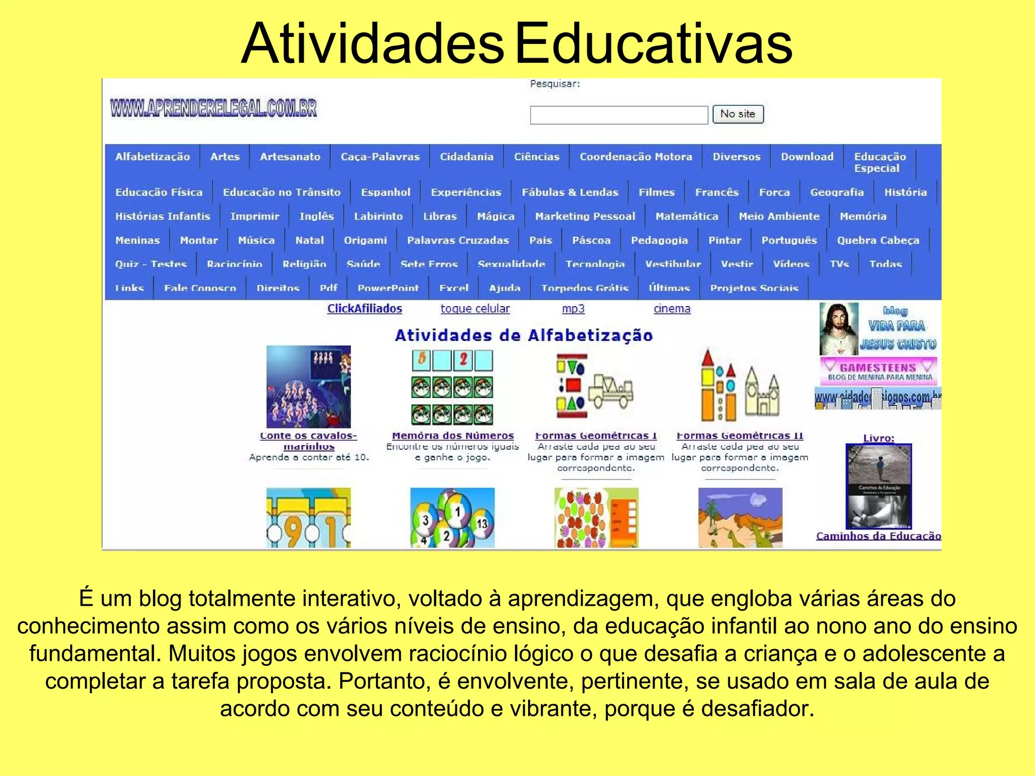 É um blogtotalmente interativo, voltado à aprendizagem, que engloba várias áreas do conhecimento assim como os vários níveis de ensino, da educação infantil ao nono ano do ensino fundamental. Muitos jogos envolvem raciocínio lógico o que desafia a criança e o adolescente a completar a tarefa proposta. Portanto, é envolvente, pertinente, se usado em sala de aula de acordo com seu conteúdo e vibrante, porque é desafiador. Atividades Educativas