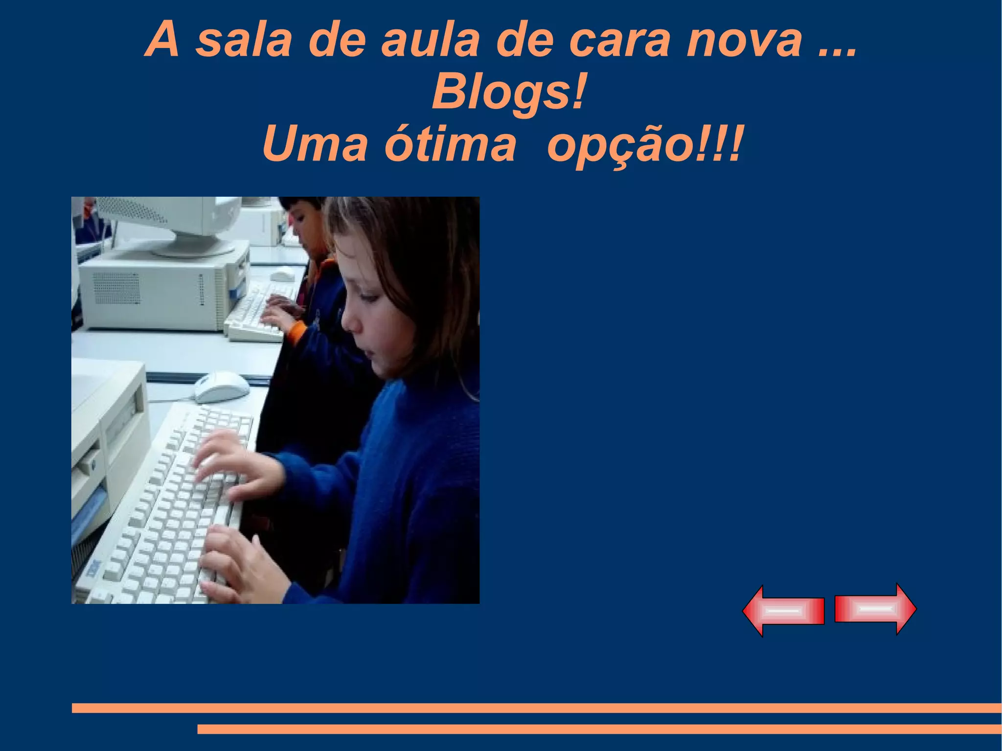 O documento discute os benefícios do uso de blogs na sala de aula, incluindo a criação de portfólios, avaliação de atividades, reflexão sobre temas atuais e compartilhamento de vídeos, textos e recomendações de leitura. Ele também fornece instruções passo a passo sobre como criar uma conta no Blogger e começar um blog.
