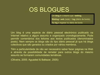 Os blogues são diários pessoais ou coletivos publicados online sobre um assunto específico. Eles podem ser usados como recursos pedagógicos tanto pelo professor quanto pelo aluno e permitem a criação de comunidades temáticas. Os blogues oferecem vantagens como a partilha de informações, debate de ideias e a interface entre a escola e a família.