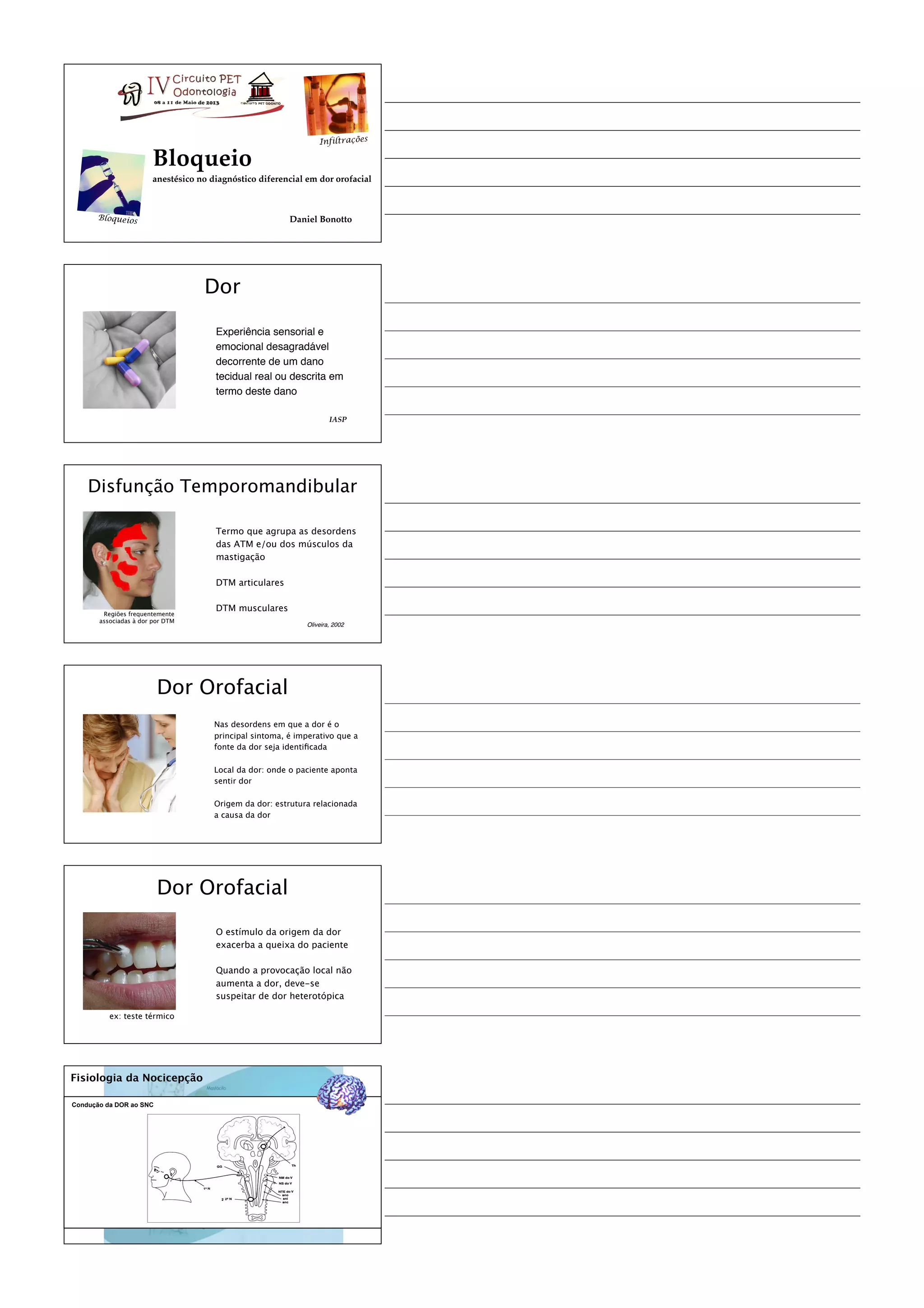 Este documento discute o uso de bloqueios anestésicos no diagnóstico diferencial da dor orofacial. Apresenta os tipos de bloqueios, incluindo injeções musculares, articulares e de nervos, e discute suas indicações, técnicas e contraindicações. O objetivo dos bloqueios é identificar a origem da dor e diferenciar dor primária de secundária através da depleção temporária da dor com a anestesia local.