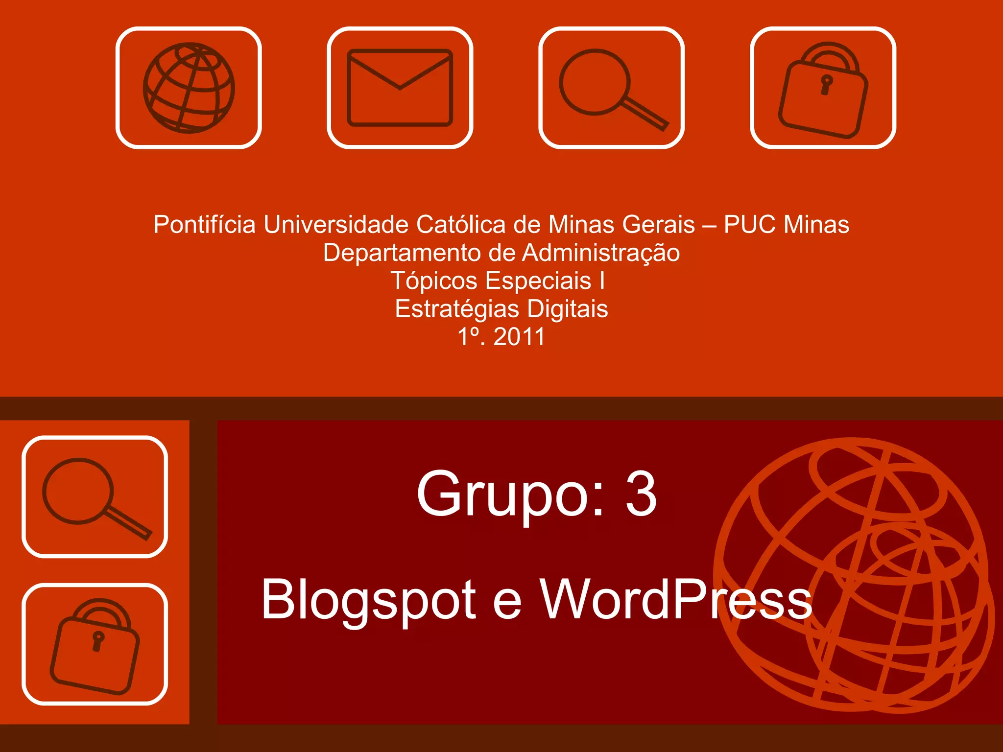 Pontifícia Universidade Católicade Minas Gerais – PUC Minas Departamento de Administração Tópicos Especiais I Estratégias Digitais 1º. 2011 Grupo: 3 Blogspot e WordPress