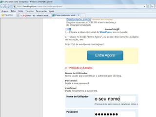 WordPress Sobre WordPress.com Blog gratuito Facilidade de uso Como você pode usar o WorPress? Compartilhar noticias Parcipar de Foruns e discuçoes Exposiçao de um pruduto ou serviço Um pouco de história: Criado em 2003, por Matt Mullenweg e Mike Little Fonte: http://pt-br.wordpress.com/about/ http://fazerblogs.com/como-criar-conta-wordpress/