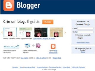 Blogspot História: -O que é o Blogspot/blogger? - Fundado em 1999 - Em 2003, a Google comprou o Blogspot Em 2009, o Blogger esteve entre os 10 sites mais acessados do Brasil com 19,1 milhões de visitantes.