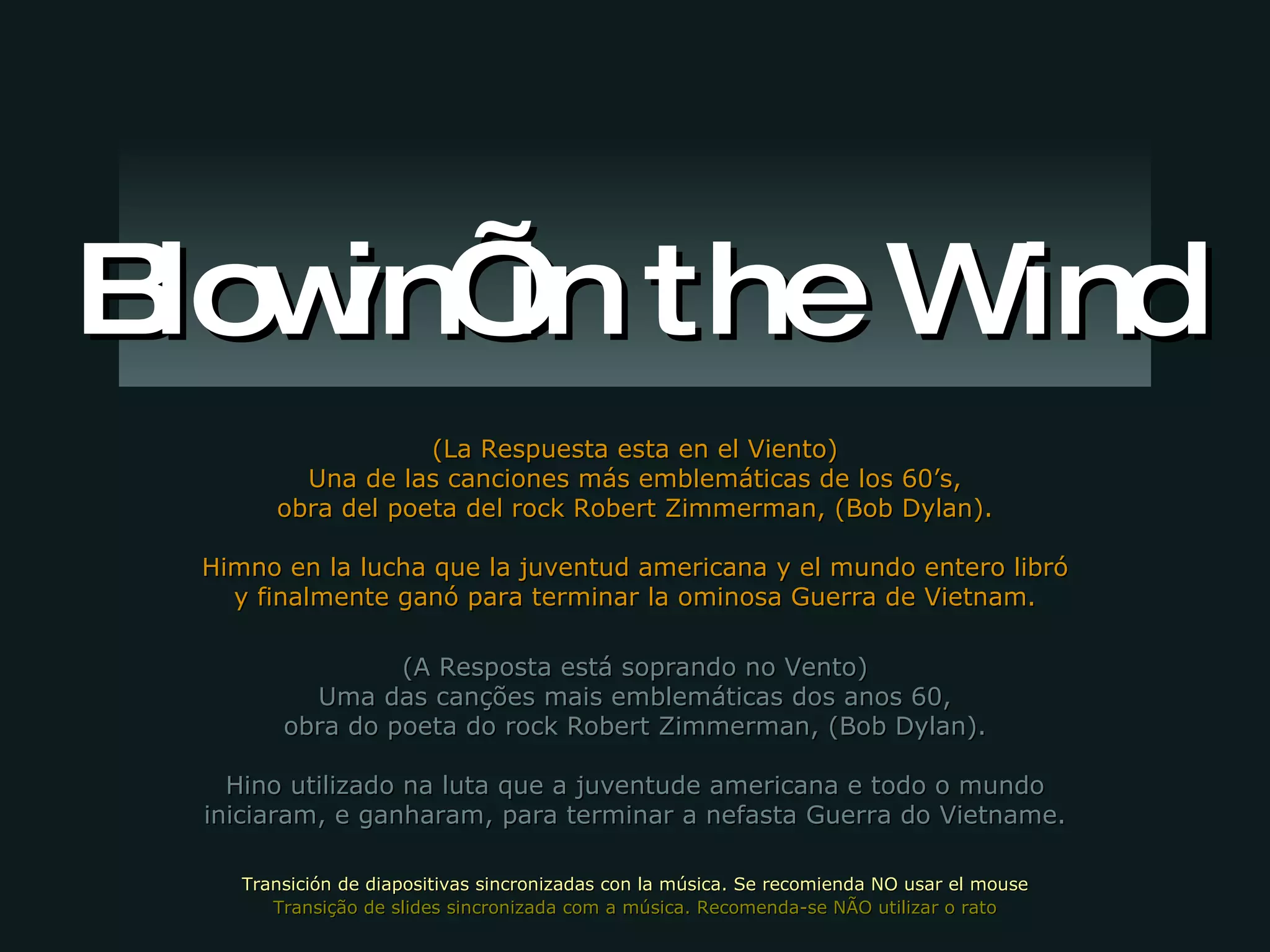 A canção 'Blowin' in the Wind' de Bob Dylan, lançada em 1962, se tornou um hino da luta pela paz e justiça durante tempos de crise social, guerras e discriminação. A letra apresenta questões filosóficas sobre temas como paz, guerra, compaixão e liberdade, refletindo uma esperança atemporal que ressoa até os dias atuais. A canção é um convite à reflexão sobre a condição humana e os desafios enfrentados pela sociedade.