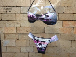 O documento lista vários itens de roupas e acessórios da marca Blue Man, incluindo biquínis, vestidos, saias, camisas e calças, com seus respectivos códigos, descrições e preços.