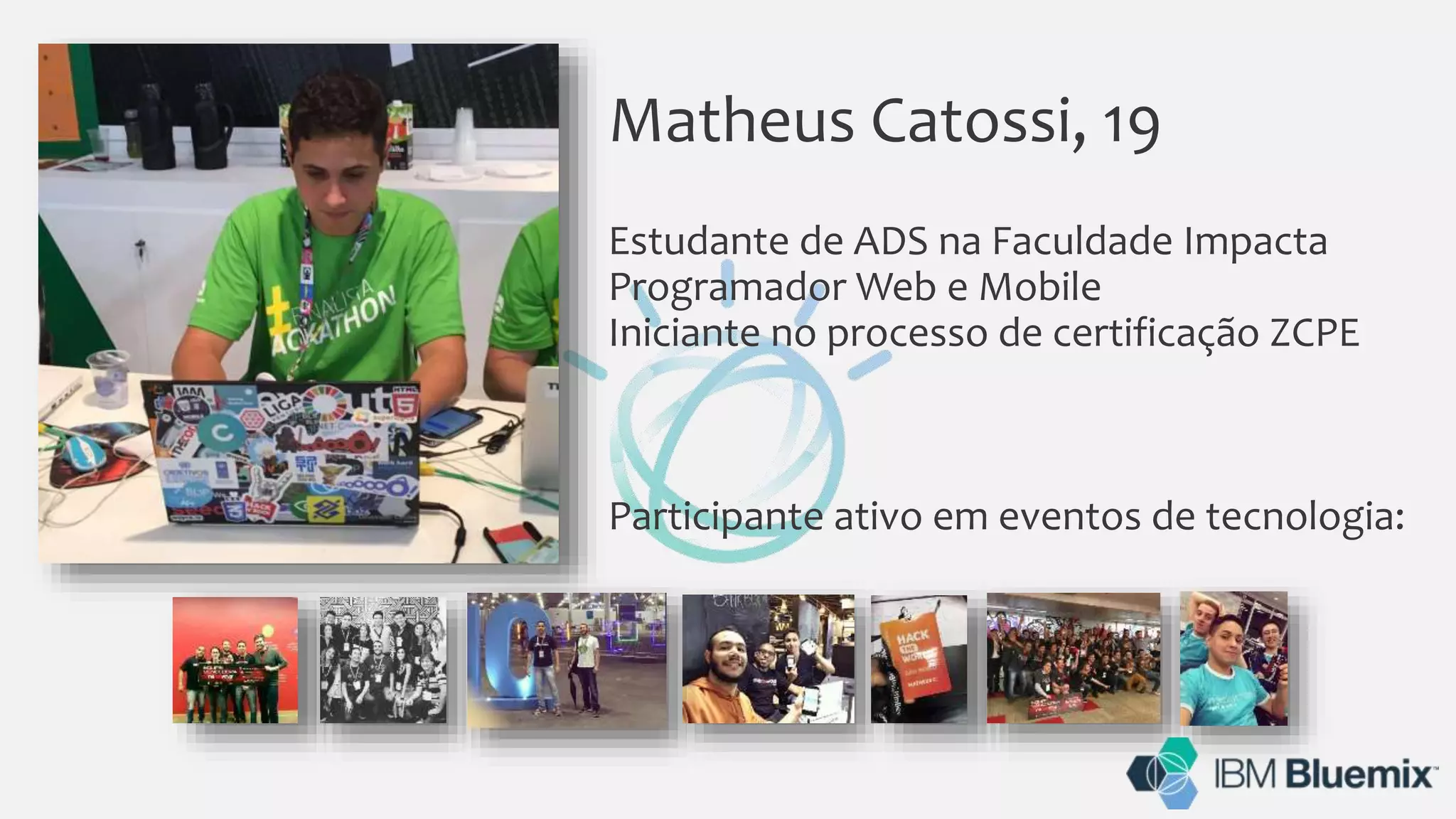 Matheus Catossi é um estudante de ADS na Faculdade Impacta e programador web e mobile iniciantes no processo de certificação ZCPE. Ele participa ativamente de eventos de tecnologia e está interessado em aprender sobre chatbots, Watson Conversation e Text to Speech.