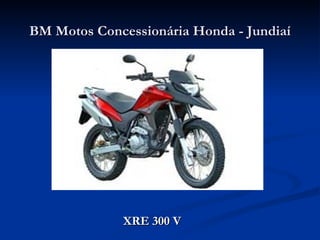 O documento lista as motocicletas disponíveis na concessionária BM Motos Honda em Jundiaí, incluindo modelos de estrada, esportivas e off-road de diferentes cilindradas, como a CB 300 R, XRE 300 V, CBR 1000 Fireblade e CRF 150.