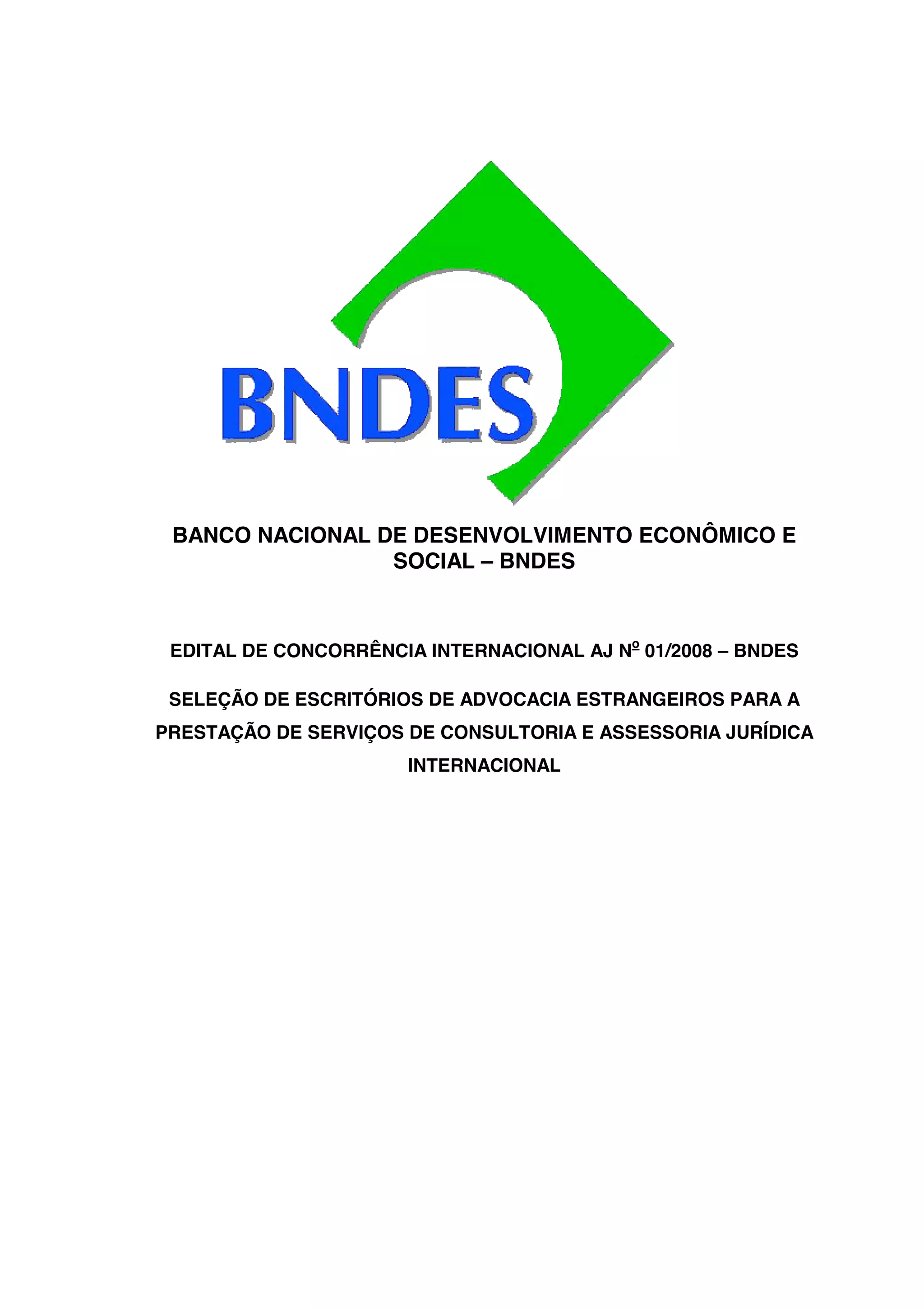O documento descreve um edital de concorrência internacional do Banco Nacional de Desenvolvimento Econômico e Social (BNDES) para selecionar até 3 escritórios de advocacia estrangeiros para prestar serviços de consultoria e assessoria jurídica internacional ao BNDES e suas subsidiárias. O edital define os requisitos de participação, o objeto da licitação e os critérios para distribuição dos serviços entre os escritórios selecionados.