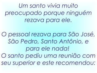 Um santo se sentia negligenciado porque ninguém rezava para ele, então seu superior recomendou que ele fizesse cartões de visita anunciando milagres por encomenda, mas pediu cuidado ao distribuí-los para não causar problemas. No final, o nome do santo não é revelado, apenas insinuado que o leitor também não recebeu seu cartão.