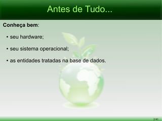 O documento fornece dicas sobre boas práticas para projetos de banco de dados, incluindo: (1) separar aplicações e bancos de dados em servidores distintos; (2) investir tempo em modelagem e projeto; e (3) usar nomes padronizados e tipos de dados apropriados para objetos no banco de dados.