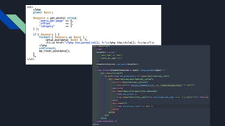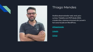 O documento fornece dicas sobre boas práticas de programação no WordPress, incluindo não usar a função query_posts(), estruturar templates em partes, usar WP_Query em loops e separar regra de negócio de templates.