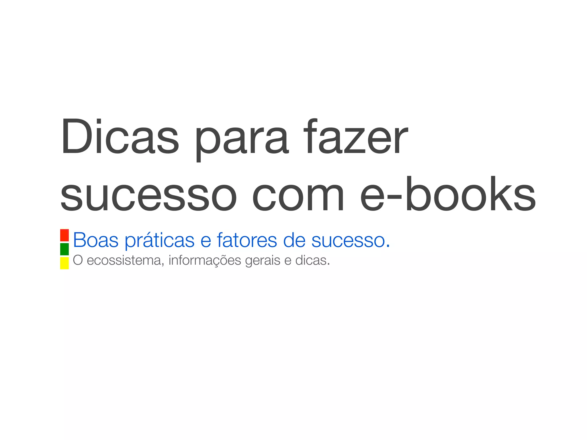 O documento oferece dicas para ter sucesso com e-books, abordando o ecossistema de venda, a criação de conteúdo e estratégias de marketing. Destaca a importância de uma boa apresentação, pricing e promoções, além de sugerir um cronograma de lançamentos e a participação de colaboradores na produção de livros. Enfatiza que a evolução contínua do produto e das estratégias de vendas é crucial para maximizar os resultados financeiros.