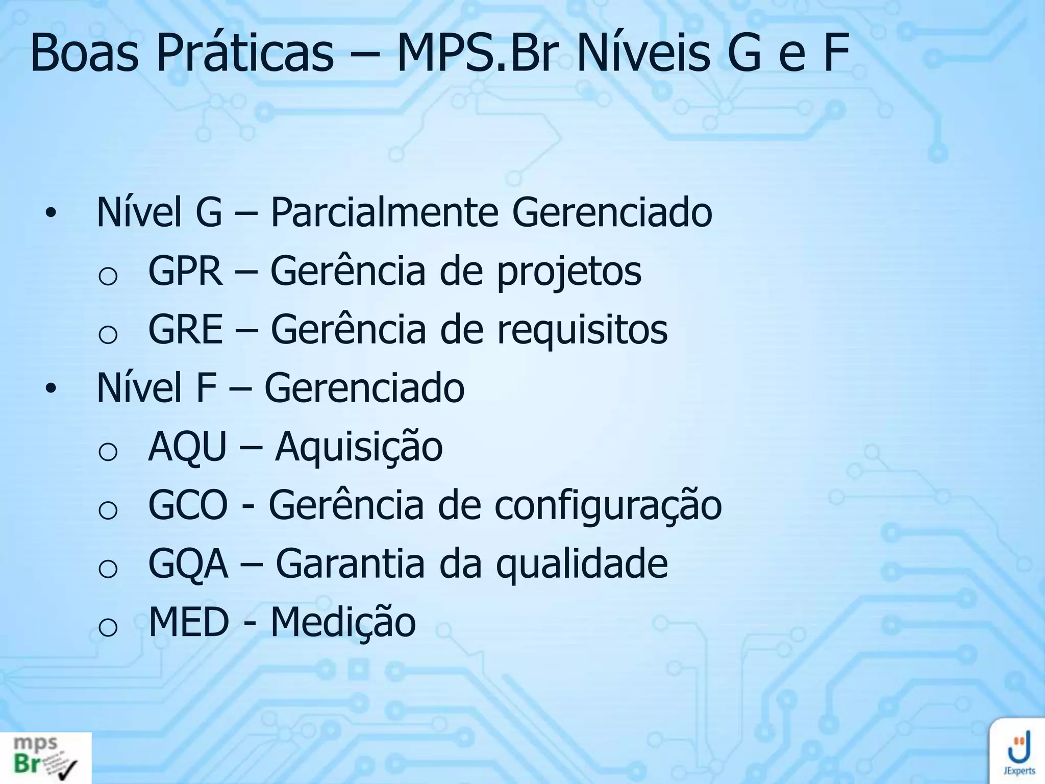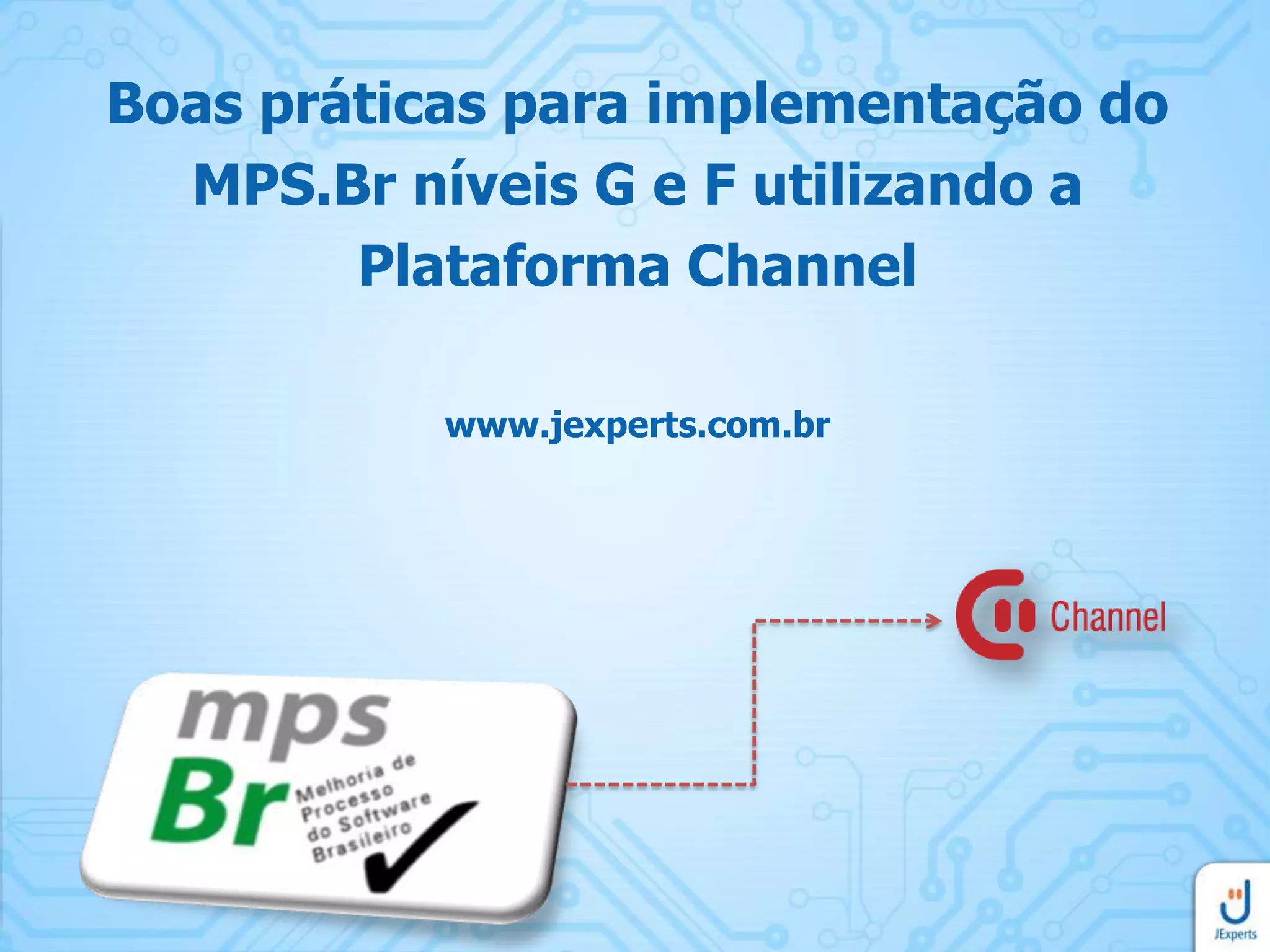 Este documento fornece diretrizes para implementar os níveis G e F do MPS.Br utilizando a plataforma Channel. Ele discute boas práticas para os processos de Gerência de Projetos, Gerência de Requisitos, Aquisição, Gerência de Configuração, Garantia da Qualidade e Medição.
