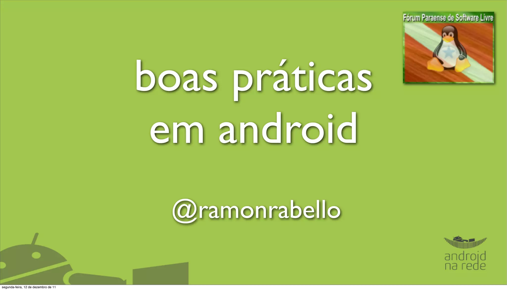 Ramon Rabello apresenta sobre boas práticas em desenvolvimento para Android. Ele discute os principais componentes do framework Android como Activitys, Content Providers, Services e Broadcast Receivers. Rabello também explica como configurar o ambiente de desenvolvimento com ferramentas como SDK, JDK e o plugin ADT para Eclipse.