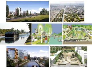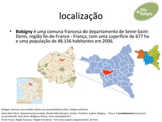 O documento descreve o projeto de requalificação urbana da cidade de Bobigny, na França. O projeto visa transformar a cidade em um local mais atraente e solidário, com foco nos bairros do centro, nordeste e oeste, além de criar uma nova área chamada Ecocidade do Canal de I'Ourcq. O projeto também inclui melhorias no sistema de transporte da cidade.