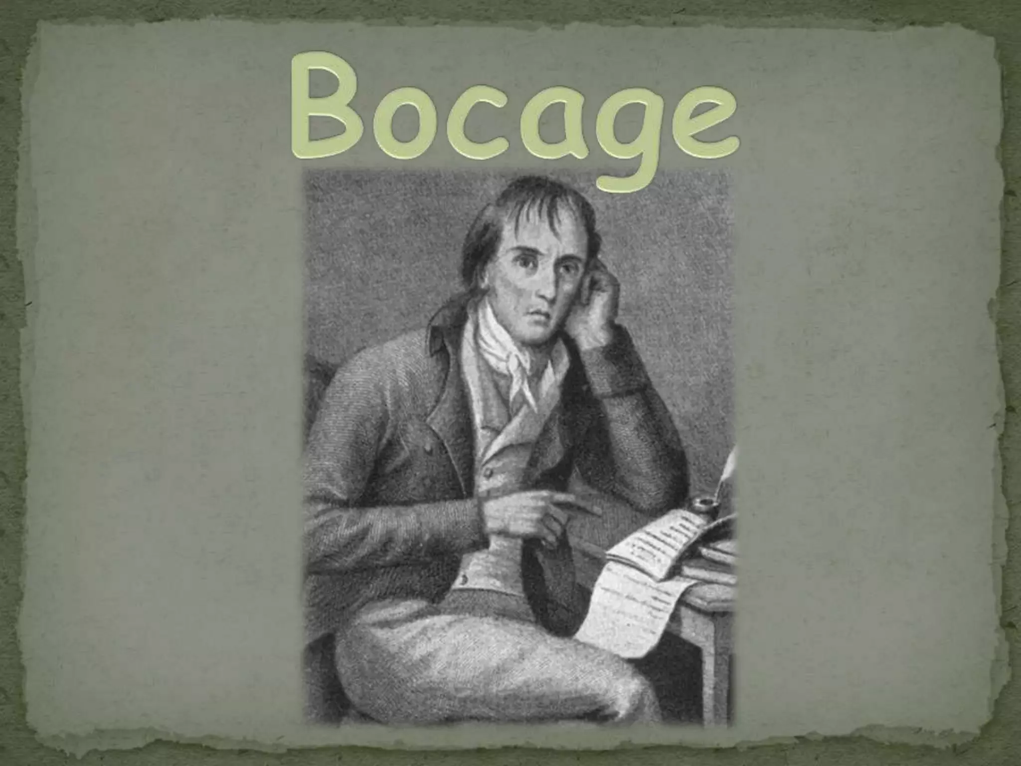Manuel Maria Barbosa du Bocage foi um poeta português do século XVIII nascido em Setúbal. Ele foi um precursor do Romantismo e viajou extensivamente pela Índia e China, mas teve problemas com a censura devido a seus escritos políticos. Bocage faleceu em Lisboa aos 40 anos, deixando uma vasta obra poética.