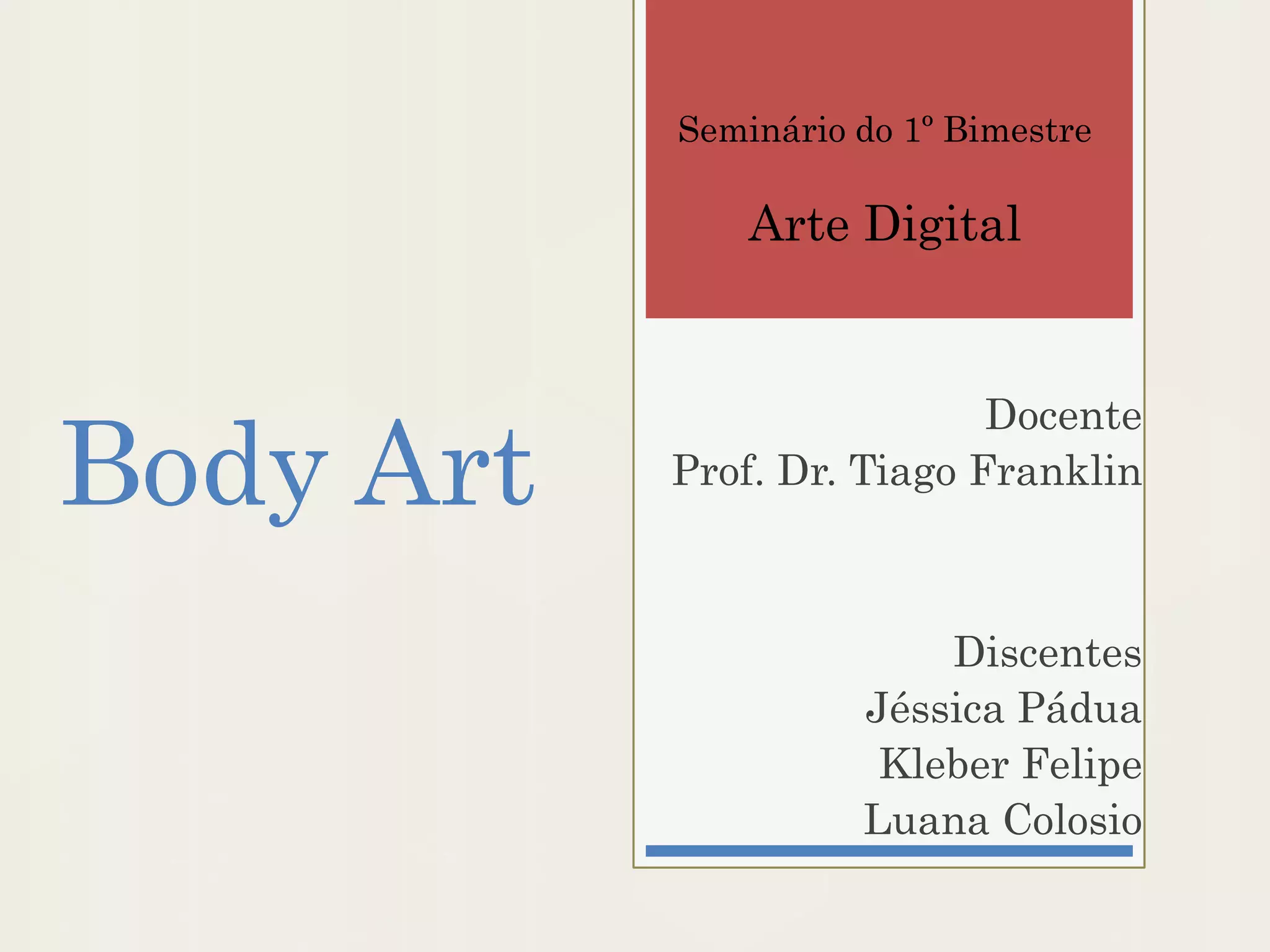 O documento discute a arte corporal (body art) no século XX, desde sua origem questionando as artes tradicionais até seu uso atual de novas tecnologias. Apresenta exemplos de artistas pioneiros como Yves Klein e Marina Abramović e estilos como tatuagens, piercings e implantes. Por fim, diferencia body art de modificação corporal e discute o uso do corpo em experiências artísticas digitais.