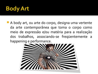 A Body Art está associada à arte conceitual e minimalismo, onde o corpo do artista é usado como suporte ou meio de expressão. Suas origens remontam a Marcel Duchamp e artistas como Yves Klein que usavam o corpo humano em suas obras. A Body Art questiona os limites sociais e artísticos da arte, tomando o corpo como suporte para intervenções associadas à dor e esforço físico.