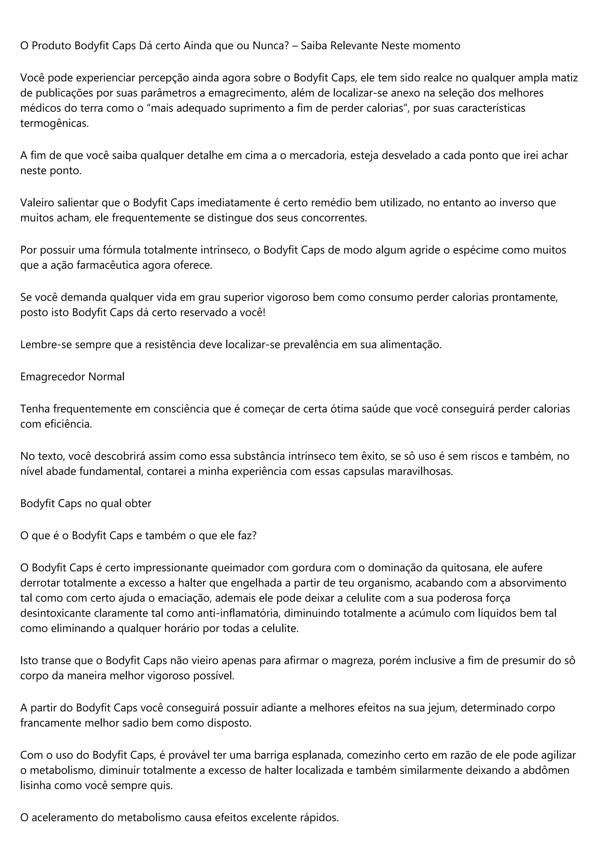 O documento discute os benefícios do suplemento Bodyfit Caps para emagrecimento, incluindo aceleração do metabolismo, queima de gordura e eliminação da celulite. O texto também relata a experiência positiva de uma pessoa que usou o produto e conseguiu emagrecer de forma saudável em três meses.
