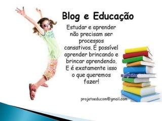 O documento discute como os blogs podem ser usados como ferramentas pedagógicas para atrair alunos para o aprendizado, expandir seus interesses e dar a impressão de uma aprendizagem não regulada. Ele lista várias maneiras de usar blogs na educação, como apresentar projetos de alunos, divulgar a proposta pedagógica da escola, apoiar disciplinas com atividades adicionais e criar um jornal escolar online escrito por alunos.