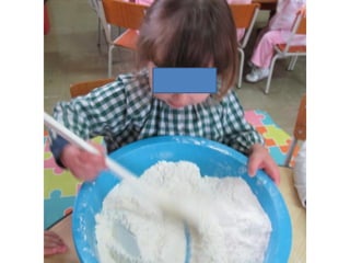 As crianças exploraram castanhas e aprenderam que podem ser usadas para carimbar e pintar embrulhos. Elas ajudaram a fazer bolachinhas de manteiga e castanha para os pais, experimentando a massa durante o processo, e embrulharam as bolachinhas que fizeram usando os embrulhos que pintaram.