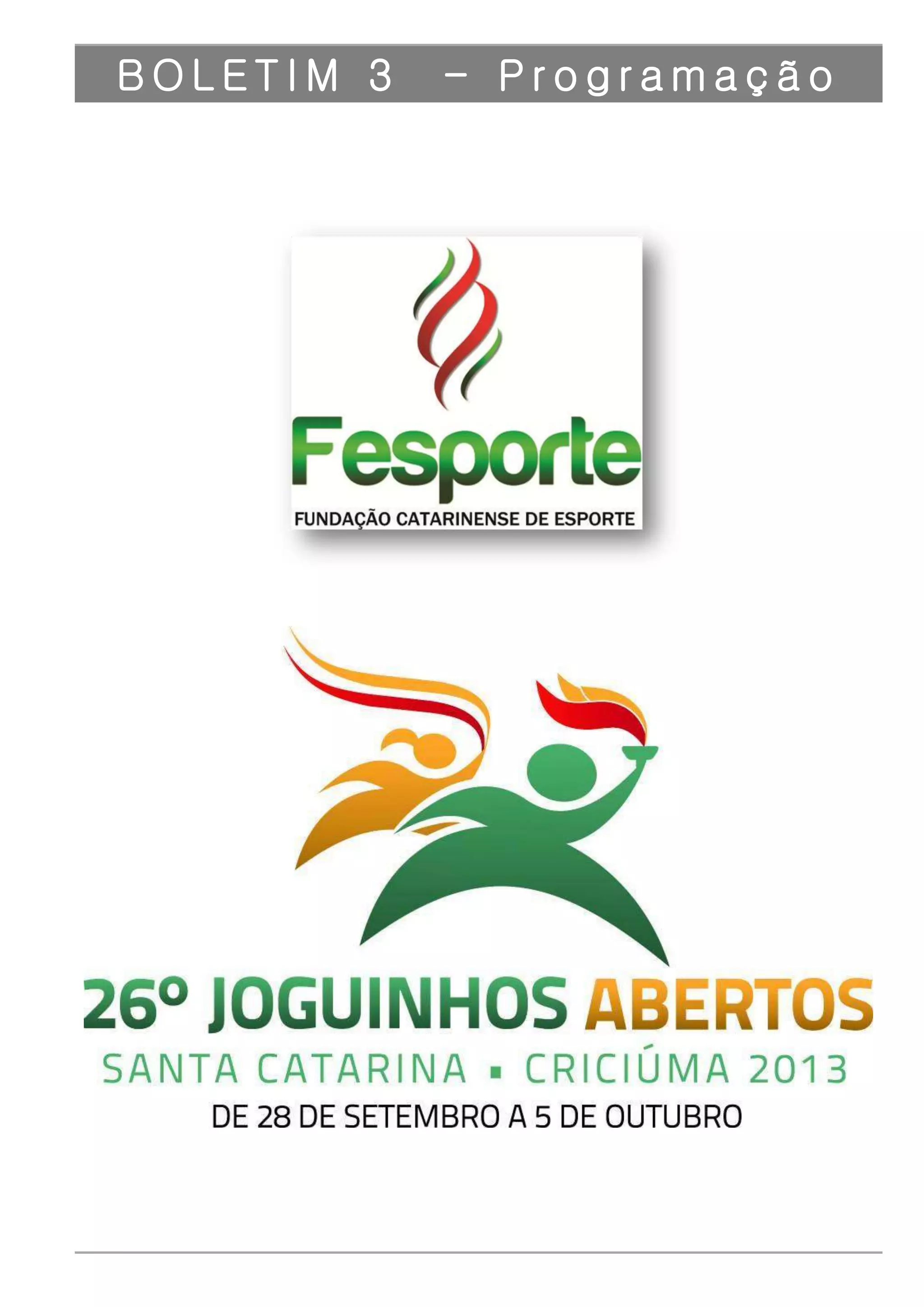 1) O documento apresenta a programação de vários esportes para os Jogos Abertos de Santa Catarina, incluindo datas, locais e horários de competições e congressos técnicos de ciclismo, ginástica artística, karatê, atletismo, basquete, futebol, futsal e ginástica rítmica.