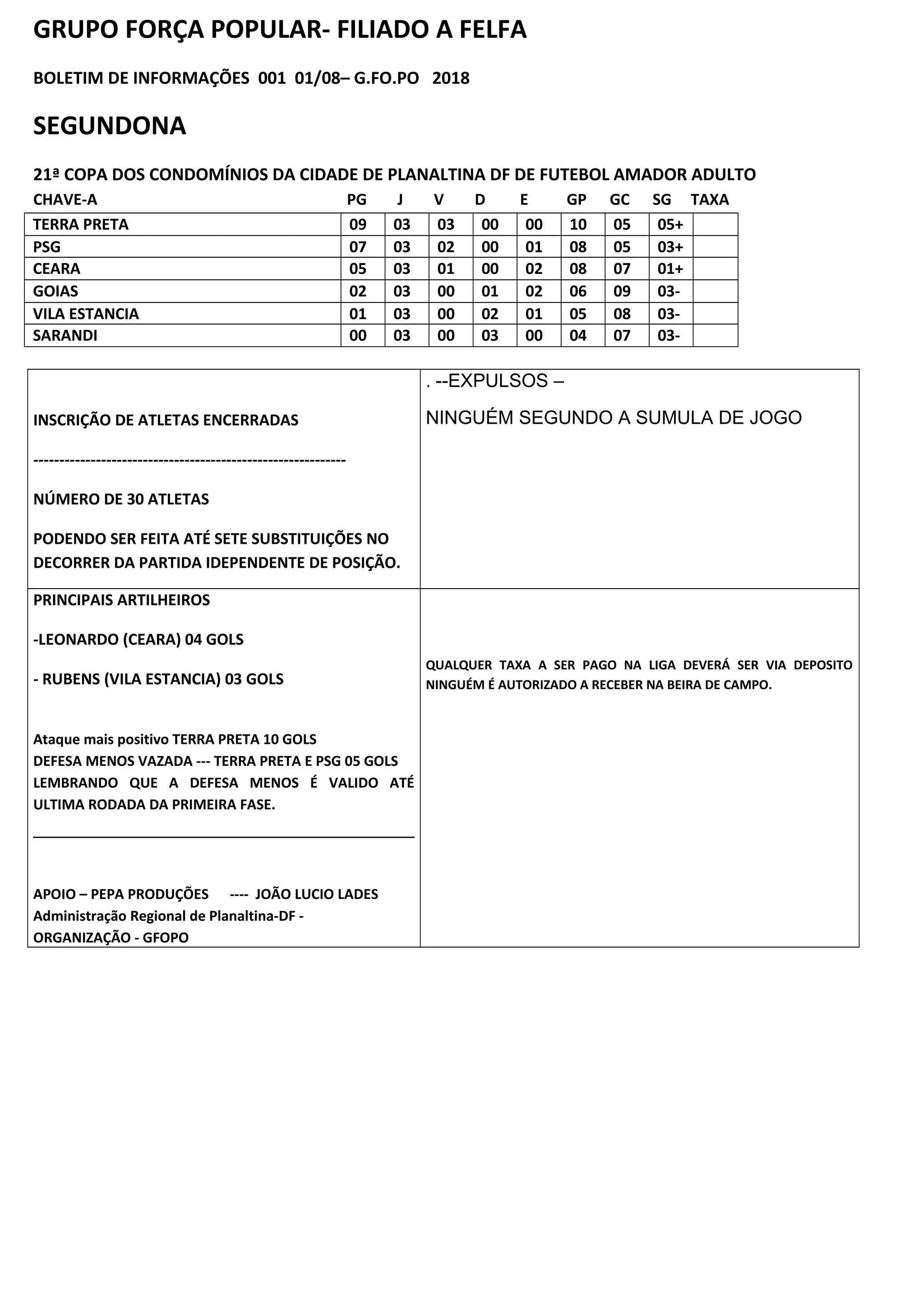 A 21a Copa dos Condomínios de Planaltina está em andamento. Terra Preta lidera o grupo com 9 pontos, seguido de PSG com 7 pontos e Ceará com 5 pontos. Leonardo, do Ceará, é o artilheiro com 4 gols. A defesa menos vazada é a do Terra Preta e PSG, com 5 gols sofridos.