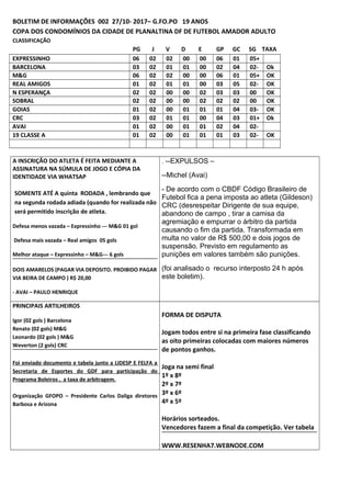 O documento apresenta a classificação do campeonato de futebol amador adulto da cidade de Planaltina, no Distrito Federal. Expressinho e M&G lideram a tabela com 6 pontos cada. O atleta Gildeson do CRC recebeu multa de R$500 e suspensão de dois jogos por desrespeitar o árbitro e dirigentes.