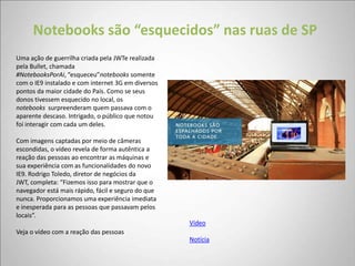 A ação #NotebooksPorAi escondeu notebooks com o IE9 em locais públicos de SP para mostrar as funcionalidades do novo navegador de forma autêntica e inesperada. Uma votação no Facebook pediu aos fãs da Volkswagen que escolhessem entre a Kombi e o Fusca para ganhar uma edição especial chamada Fanwagen. Espaços foram criados nos aeroportos de Paris para experimentação de produtos da Samsung e Sony.