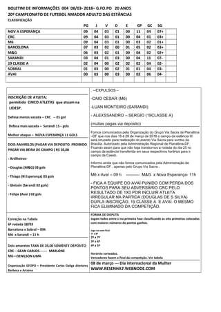 O documento resume a classificação do 20o Campeonato de Futebol Amador Adulto das Estâncias após a 9a rodada. A equipe Nova Esperança lidera com 9 pontos, seguida por CRC e M6 com também 9 pontos. O Avaí permanece na lanterna sem pontos. O documento também informa sobre alterações de datas e locais de jogos, punições a jogadores e a equipe do Avaí, e a forma de disputa das fases finais do campeonato.