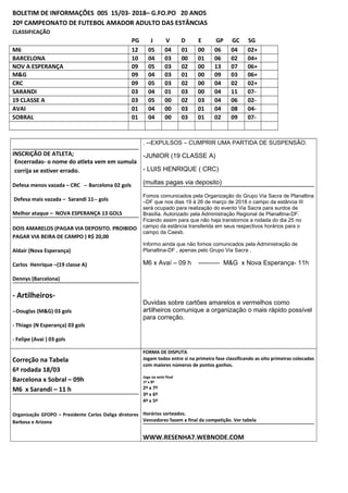 O boletim informa sobre a 20a edição do campeonato de futebol amador, com a classificação das equipes e artilheiros. O campo da estância III será ocupado por evento paralímpico entre 19 a 26 de março, transferindo-se dois jogos para outro campo. É informada também a forma de disputa da competição.