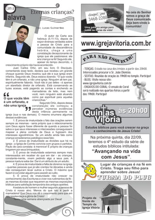 O documento é um boletim de igreja que anuncia eventos e cultos na Igreja Vitória. Ele discute a importância de crescer na fé e não permanecer como "crianças eternas", listando evidências de imaturidade espiritual como orações repetitivas, divisões na igreja e falta de obreiros. O boletim também convida os membros a participarem de cultos, estudos bíblicos e reuniões de oração durante a semana.