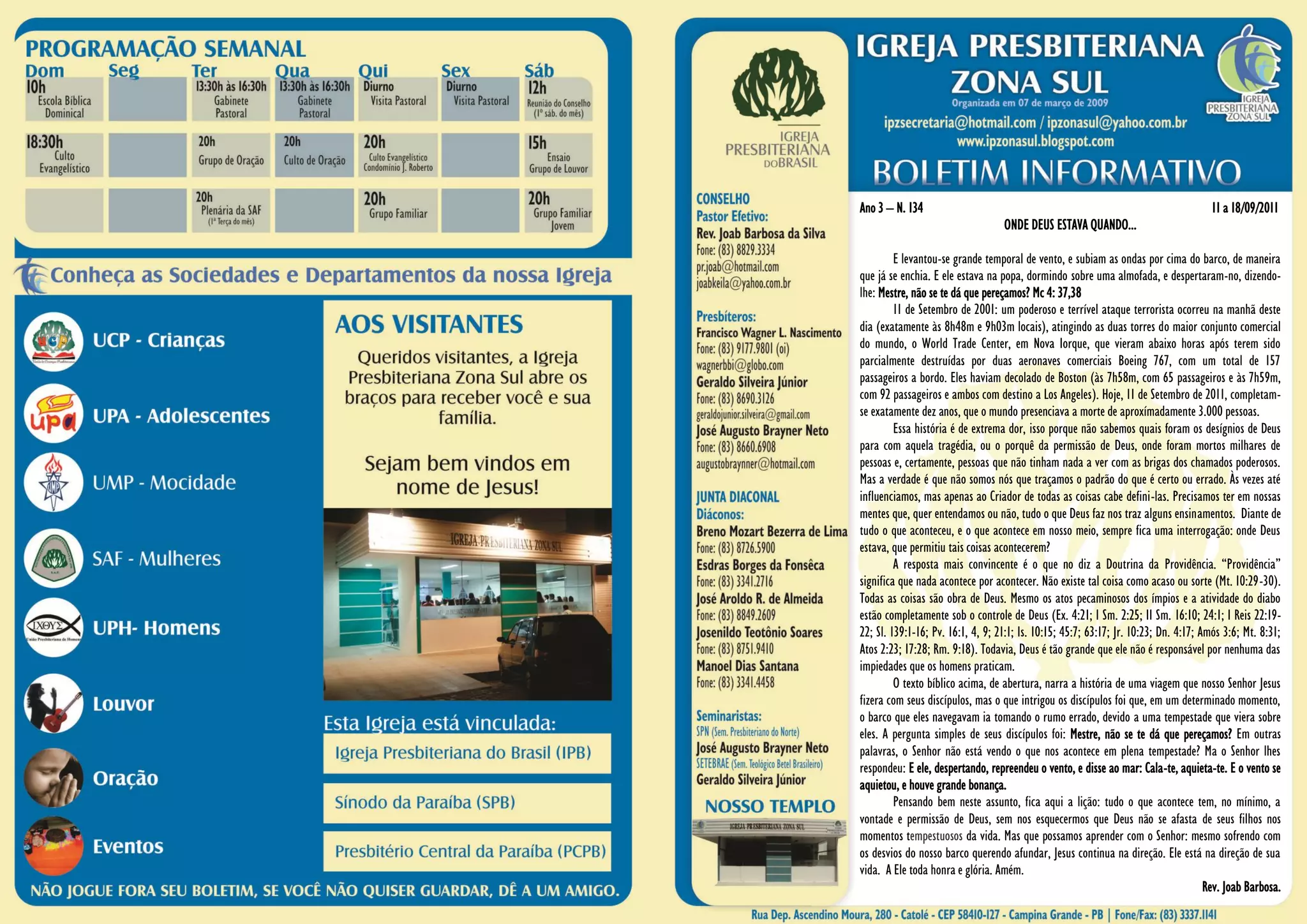 O documento resume um culto realizado na Igreja Presbiteriana Zona Sul, incluindo a leitura bíblica do capítulo 4 de Marcos sobre Jesus acalmando a tempestade, avisos sobre eventos futuros como um programa de rádio e recebimento de novos membros, e notícias sobre missões.