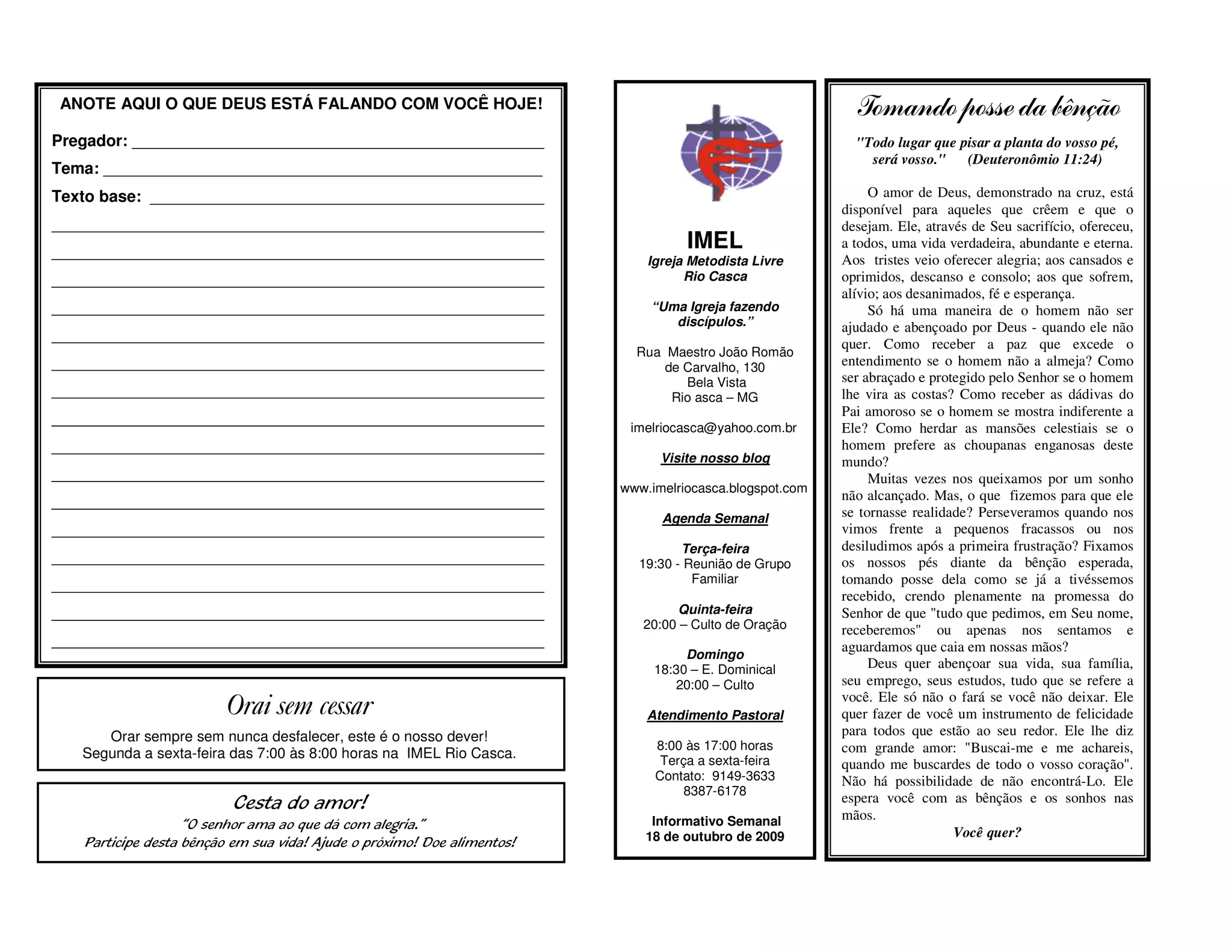 Este boletim informativo da Igreja Metodista Livre de Rio Casca convida os membros a participarem de vários eventos na semana, como cultos, reuniões de oração e de grupos familiares. Também enfatiza a importância da doação para as missões e da reflexão sobre o tipo de crente que se deseja ser.