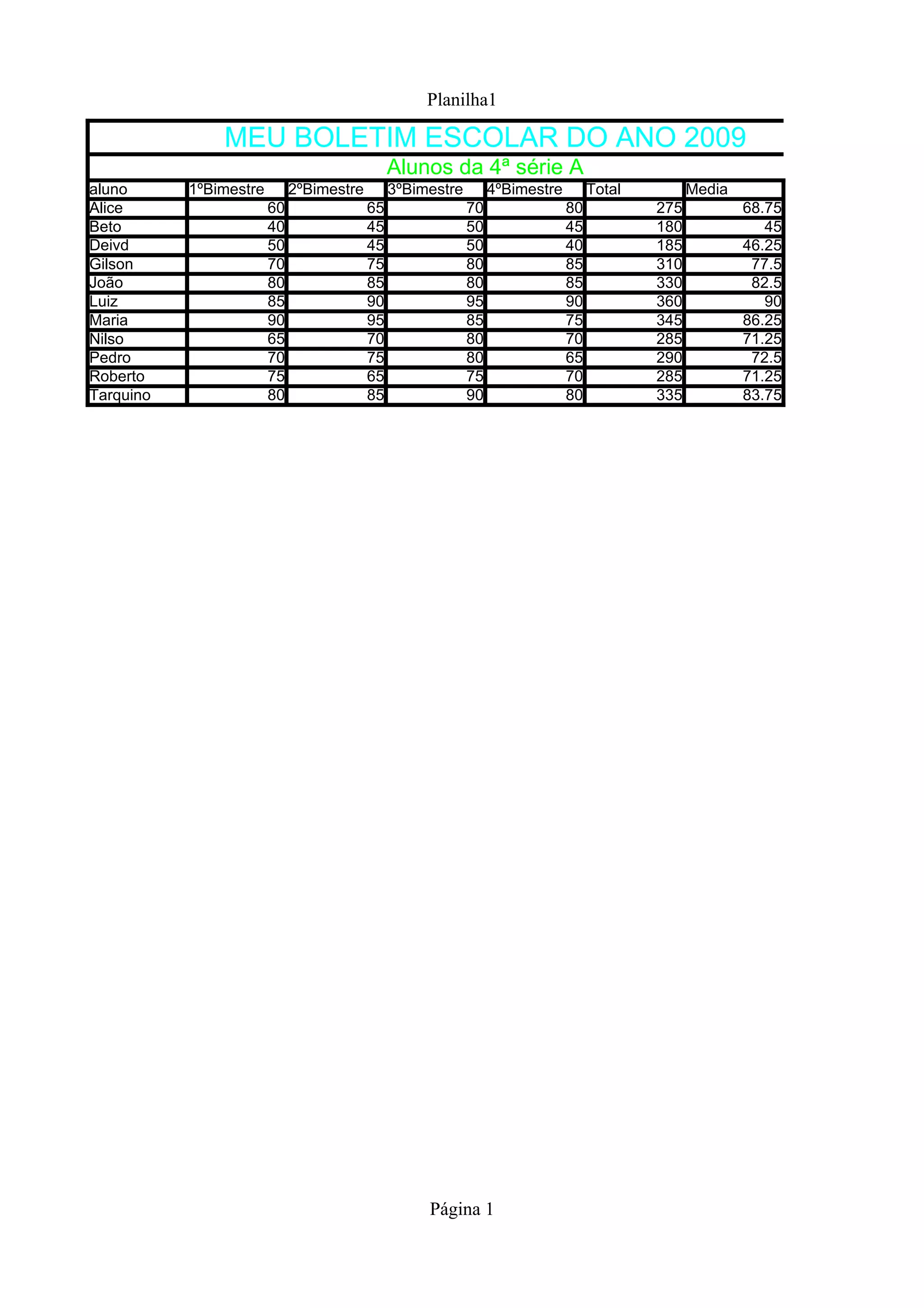 Esta planilha apresenta as notas do boletim escolar de alunos da 4a série A no ano de 2009, com as médias dos quatro bimestres e a média geral de cada aluno, indicando também se foram aprovados ou reprovados.