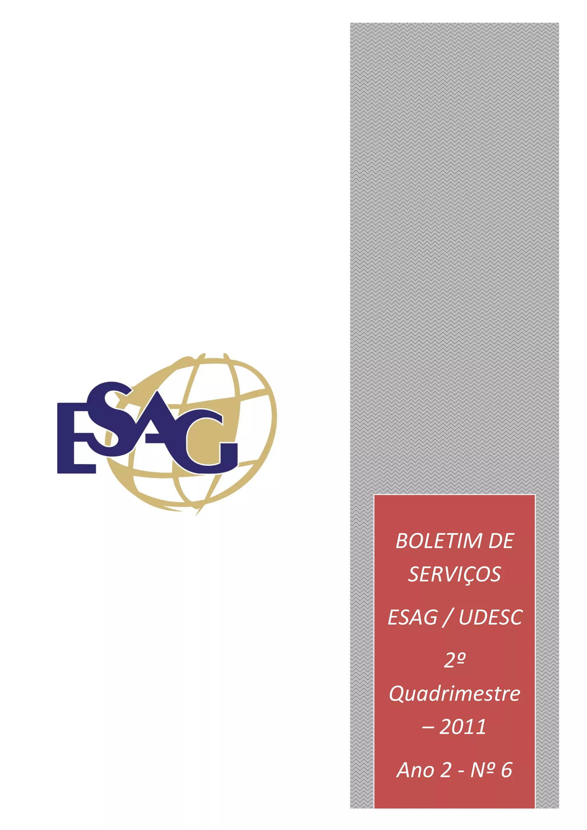 Este boletim de serviços apresenta a composição da equipe diretiva da ESAG e resume as principais resoluções dos conselhos CONSAD, CONSUNI e CONSEPE no segundo quadrimestre de 2011, além de resumir as ações nas áreas de ensino, pesquisa, extensão e administração da ESAG no período.