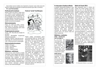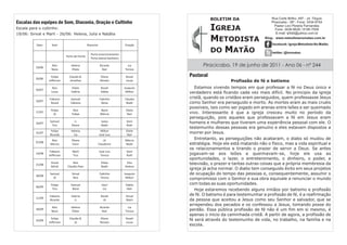 O boletim informa sobre a escala de serviços para o culto e aniversariantes da semana. Dois irmãos farão profissão de fé e batismo no culto. Haverá ofertas missionárias e uma festa no "arraiá" dos Marques no dia 22. O pastor Alexandre Robles falará no culto de 07/08.