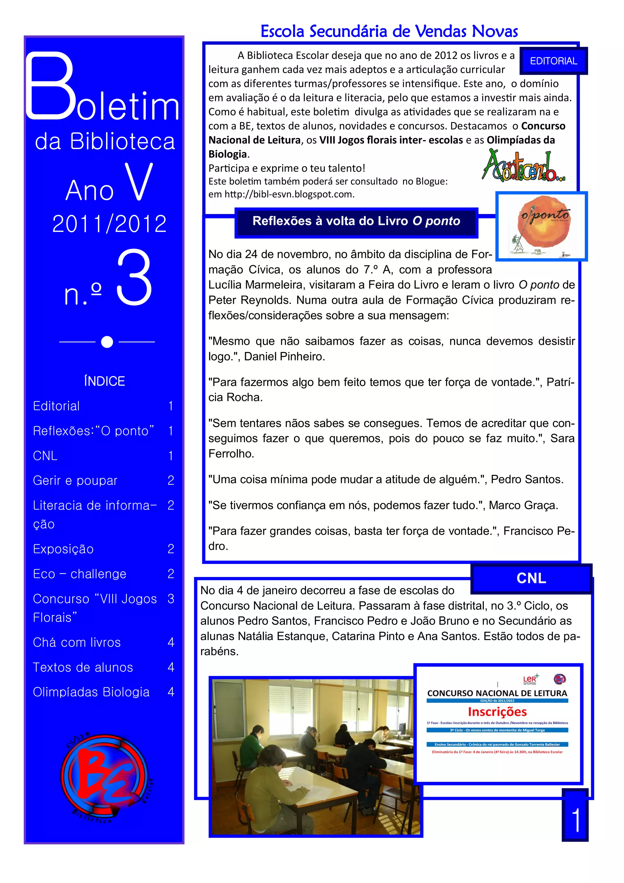 Este boletim da biblioteca escolar descreve as atividades realizadas no ano letivo de 2011/2012, incluindo o Concurso Nacional de Leitura, os Jogos Florais inter-escolas e as Olimpíadas da Biologia. Além disso, relata sessões sobre educação para o consumidor, literacia de informação e uma exposição sobre direitos humanos. O boletim inclui também reflexões de alunos sobre o livro "O Ponto" e textos criativos de outros alunos.