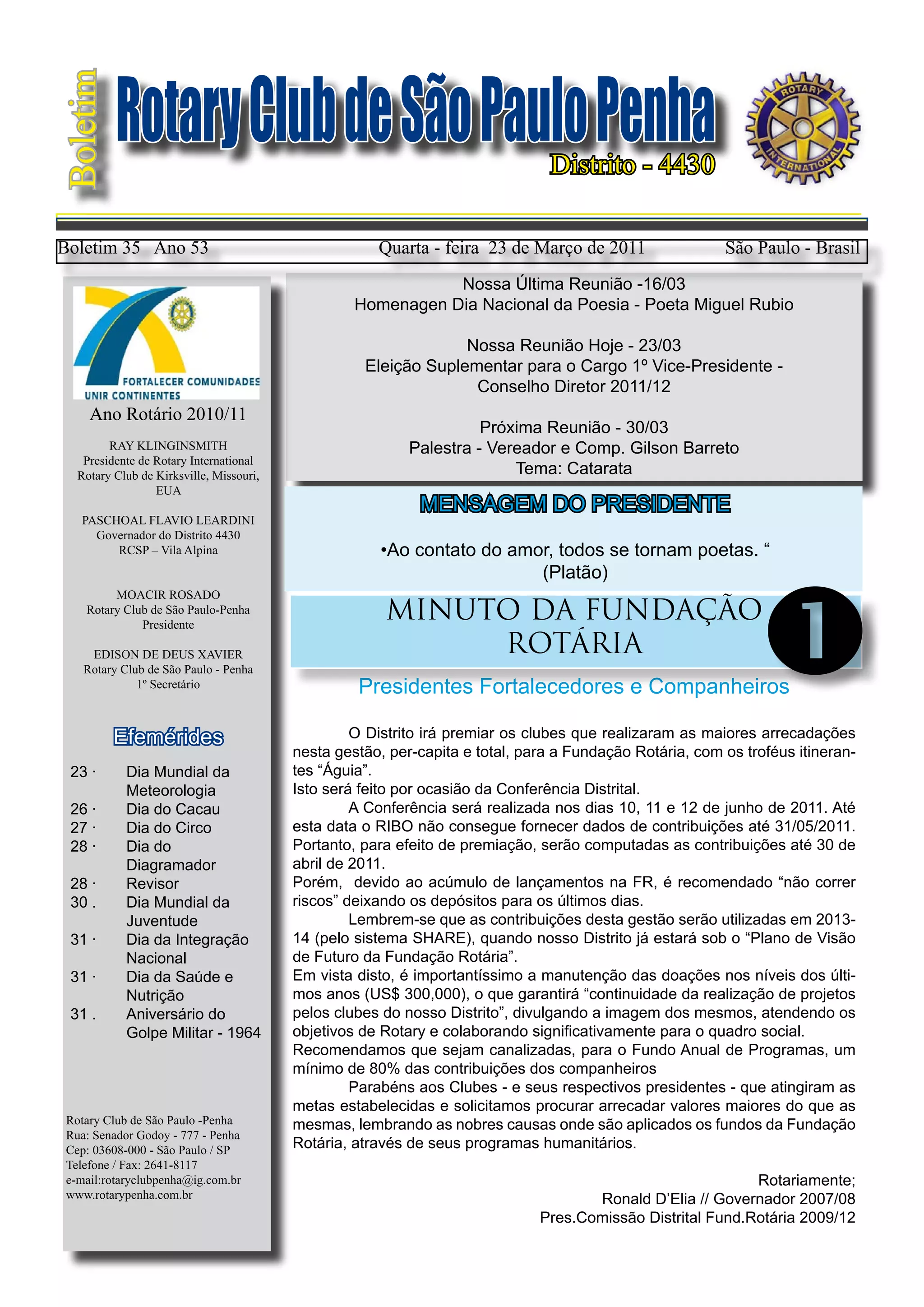 Este boletim resume as atividades do Rotary Club de São Paulo Penha, incluindo a última reunião que homenageou o Dia Nacional da Poesia e a eleição suplementar para o cargo de 1o Vice-Presidente. Além disso, lista os eventos do clube e do distrito para os próximos meses, como palestras, festas e seminários. Finalmente, relata uma doação da Mercedes-Benz do Brasil para projetos rotários de ajuda no Chile após um desastre.