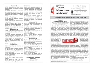 O documento resume as atividades e eventos realizados pela Igreja Metodista No Matão ao longo de 2015, incluindo cultos, encontros, acampamentos e outras atividades. O pastor Rinaldo Ito reflete sobre buscar a palavra de Deus em 2016 em meio a problemas políticos, econômicos e sociais, lembrando que "a palavra de Deus permanece eternamente". O boletim encerra convidando os leitores para eventos em 2016.