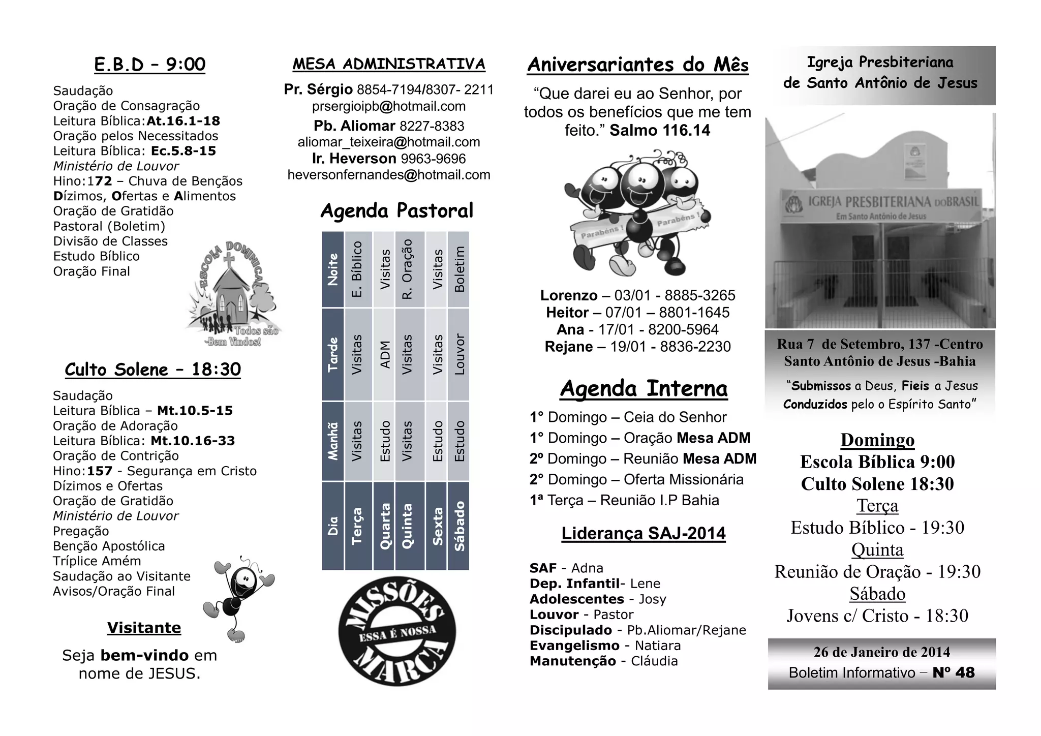 O documento fornece a agenda de atividades de uma igreja presbiteriana para a semana, incluindo cultos, estudos bíblicos, visitas e reuniões. Contém também informações sobre aniversariantes, liderança da igreja e avisos.